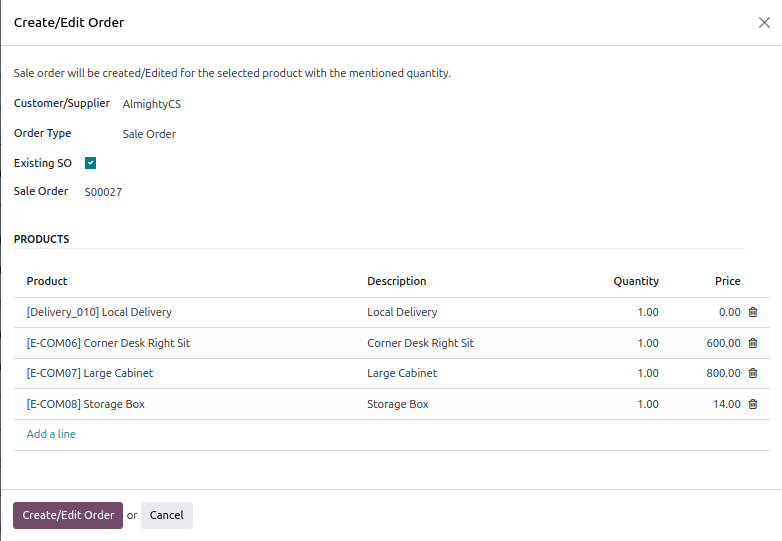 - Sale Order: To add products to a sale order, select "Sale Order" under "Order Type." If you wish to add products to an existing sale order, check the "Existing SO" field, then choose the desired sale order from the "Sale Order" dropdown.
