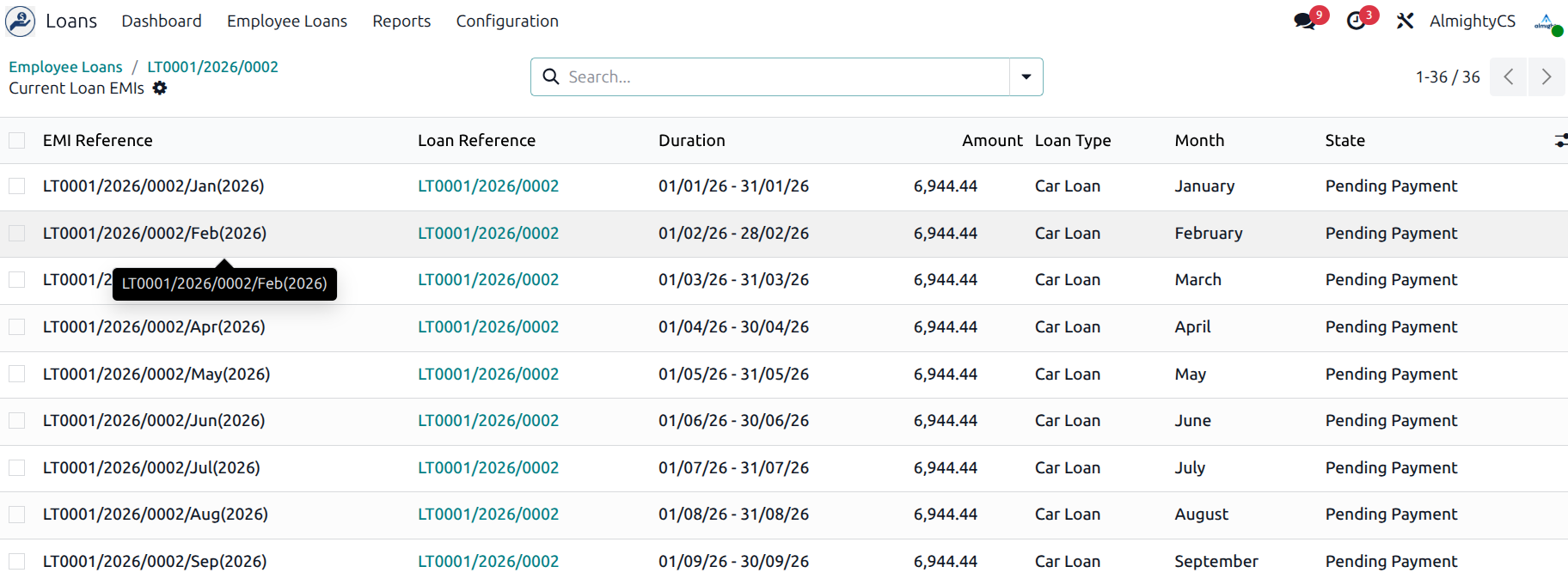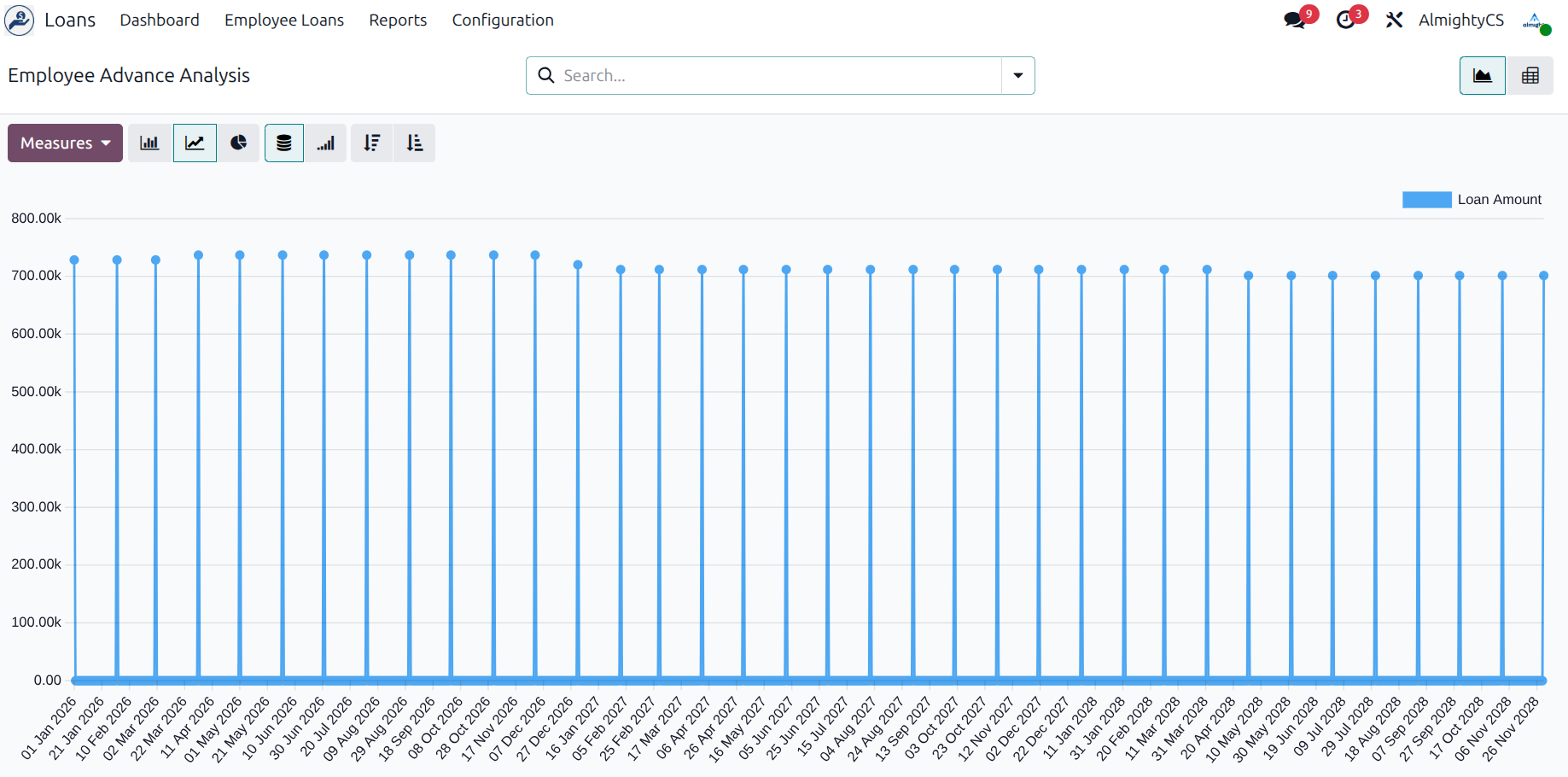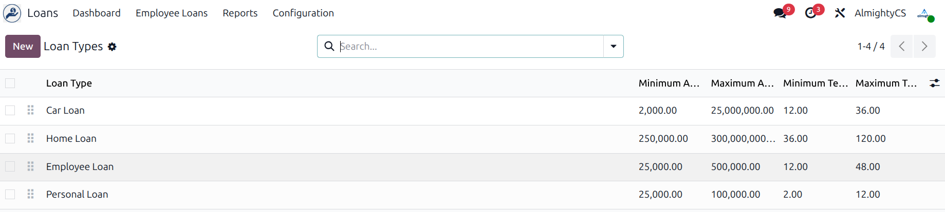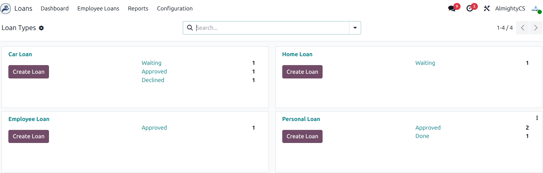 This module helps organizations efficiently manage employee loans from request to completion.It allows users to define multiple loan types, submit and approve loan requests, track EMIs, automatically generate accounting entries, and produce detailed loan reports. It provides end-to-end loan tracking with automated EMI calculations and seamless accounting integration, reducing manual effort, minimizing errors, and saving time.