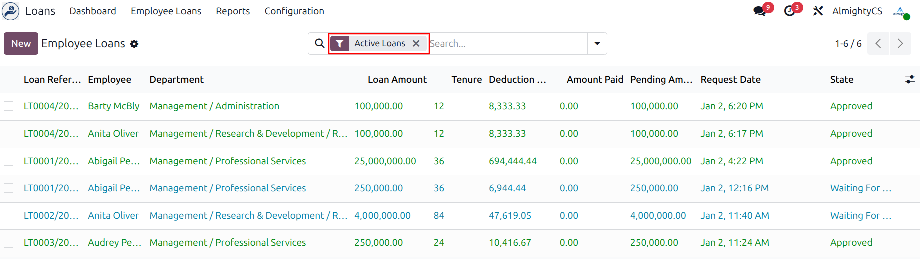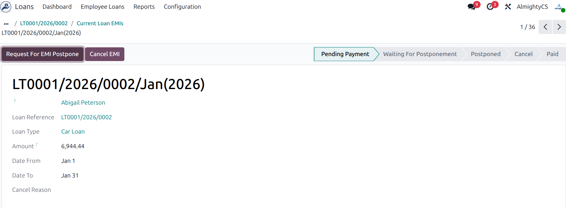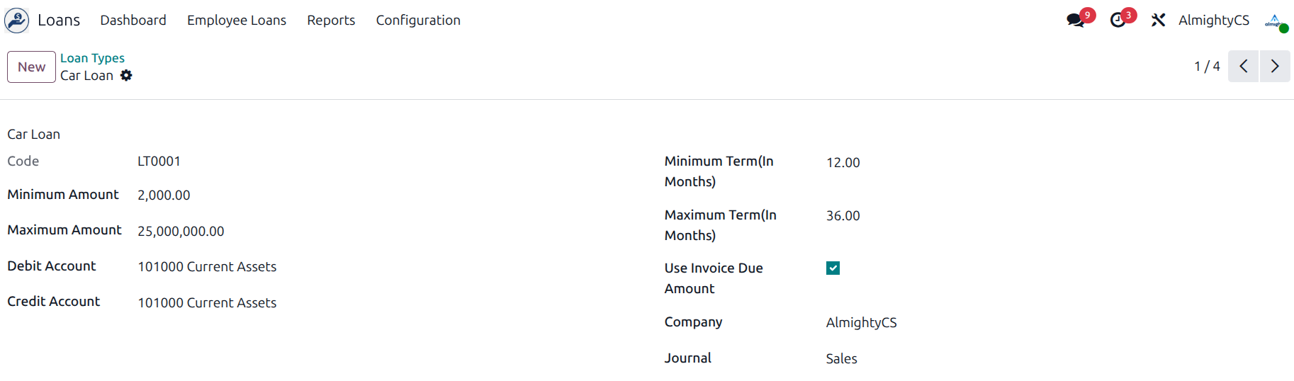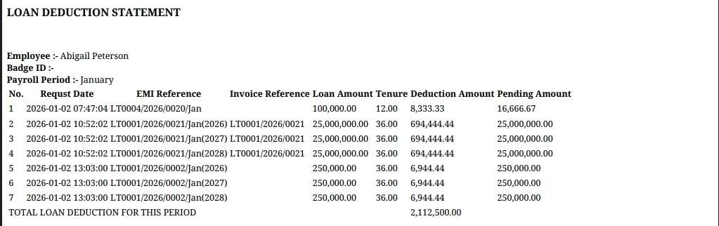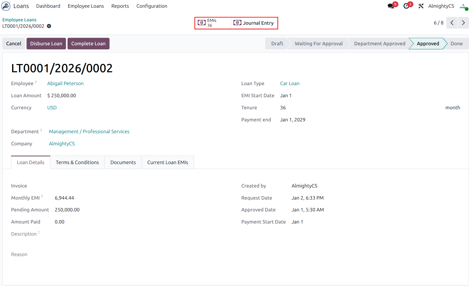 This module helps organizations efficiently manage employee loans from request to completion.It allows users to define multiple loan types, submit and approve loan requests, track EMIs, automatically generate accounting entries, and produce detailed loan reports. It provides end-to-end loan tracking with automated EMI calculations and seamless accounting integration, reducing manual effort, minimizing errors, and saving time.