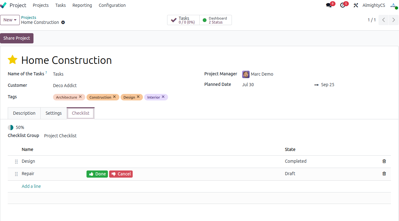 - Easily update the task state in the checklist using "Done" and "Cancel" buttons.