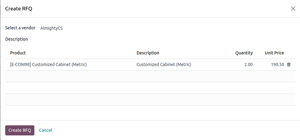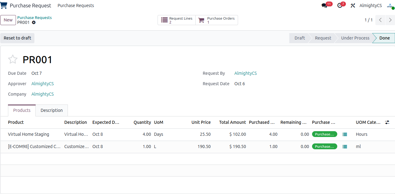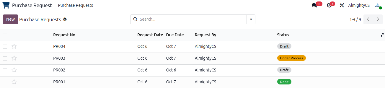 Allow users to create Purchase request based on their need. Approvers can approve req and do needed procurement. On req status can be seen for RFQ and related order status.