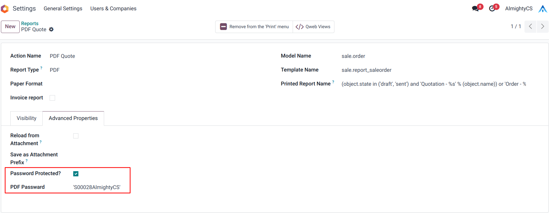 In default odoo there is no option to print Password protected PDF Reports. In many cases we need to provide some password protected PDF report, to manage such use cases we have added this module. Using this module you can alls user to print password protected reports only. Passwords can be configured per report based on requirement.