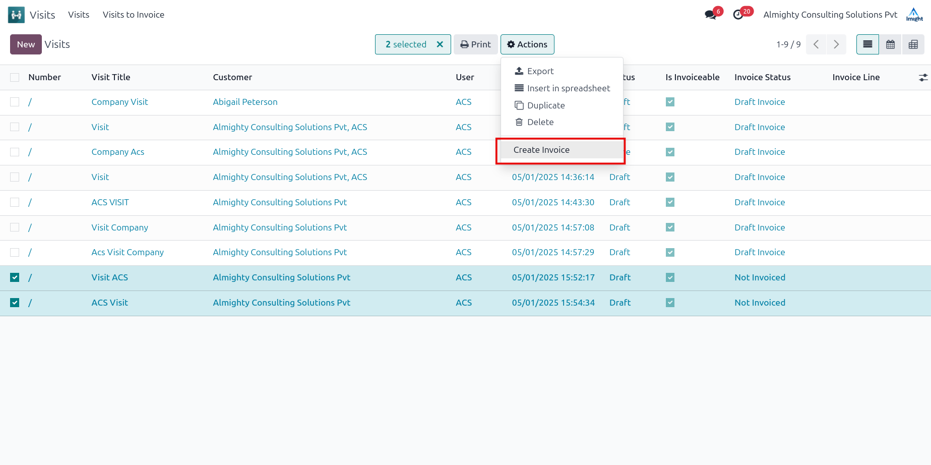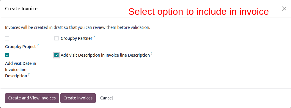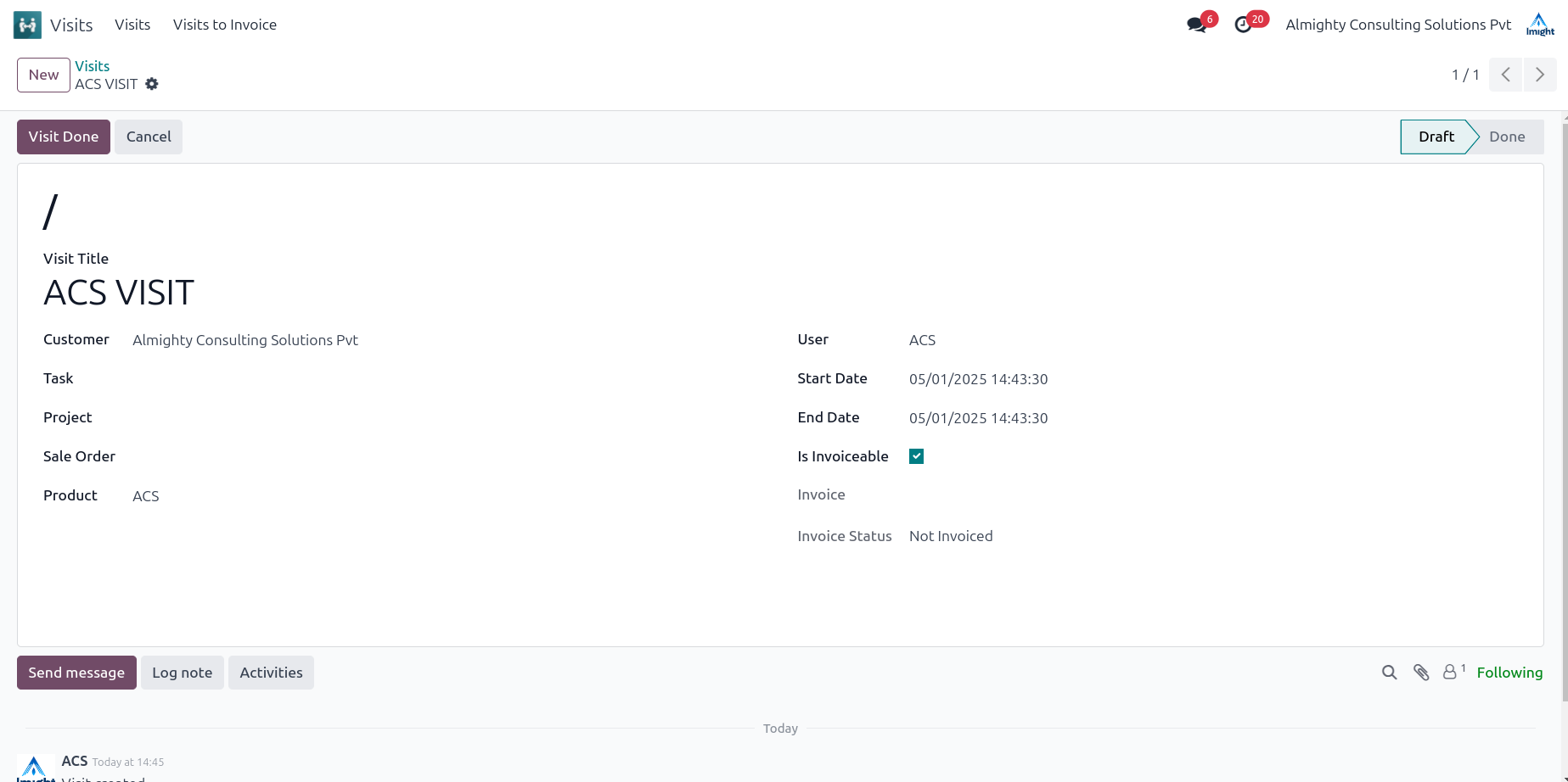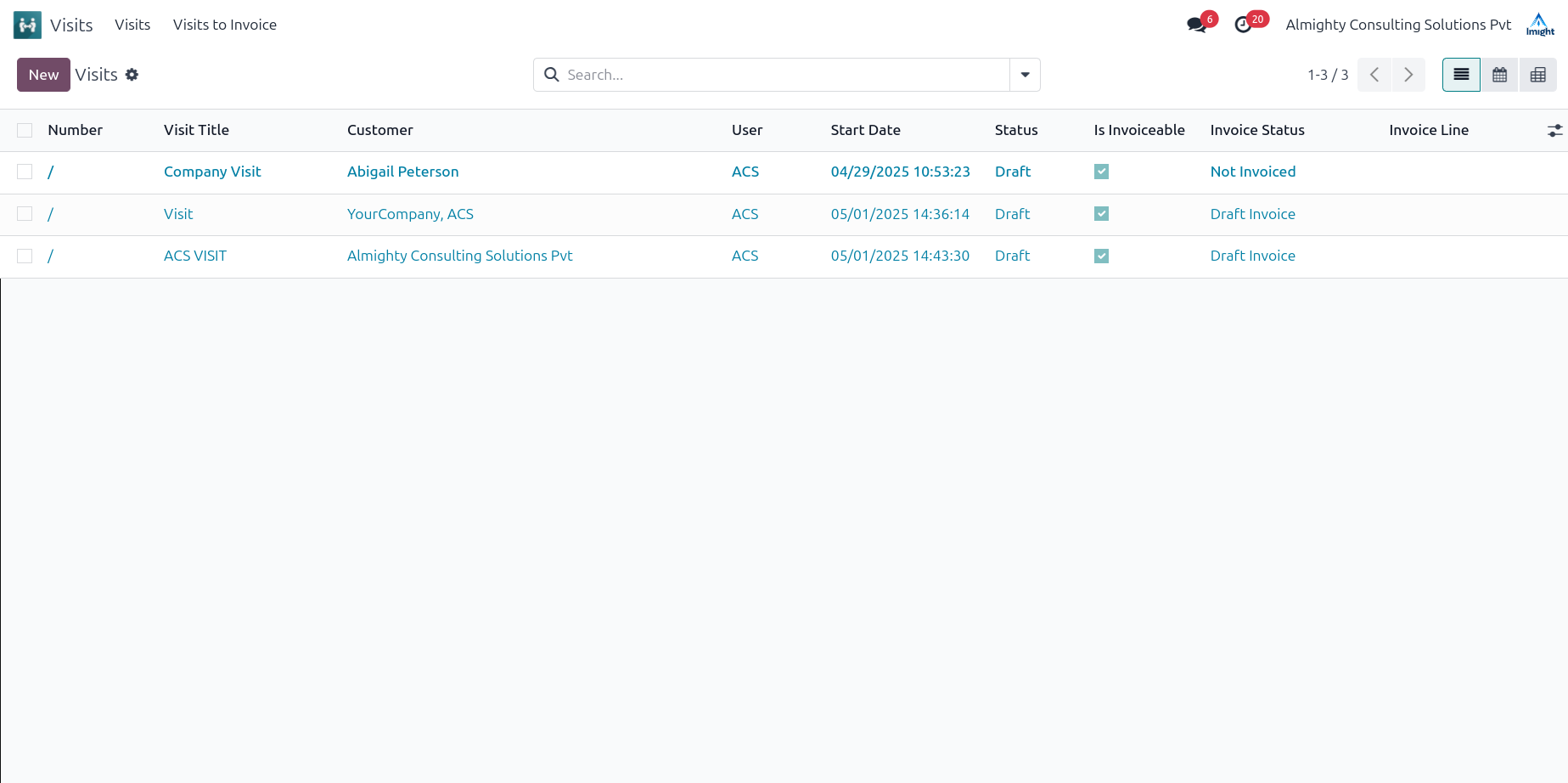 This feature helps to track the innvoicing status of visits.It shows whether a visit can be invoiced and provides details about the related invoice.You can see if a visit has been invoiced or not.The invoicabla checkbox is for whether the visit is invoicable or not.